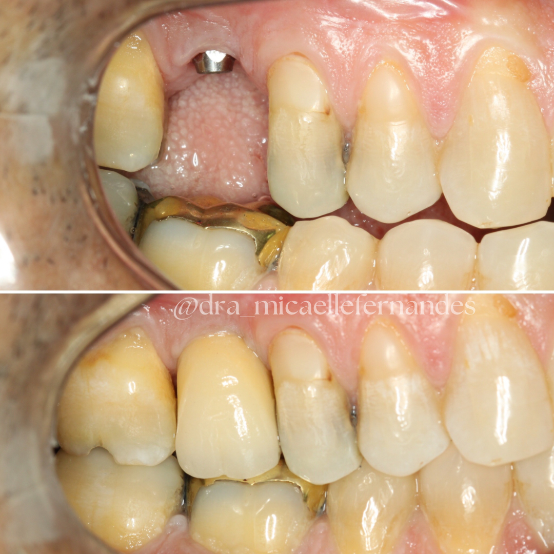 Os implantes dentários são uma solução eficaz e duradoura para repor a falta de dentes, devolvendo não apenas a estética do sorriso, mas também a funcionalidade da mastigação. Feitos de titânio ou cerâmica, os implantes se integram ao osso, proporcionando uma base sólida para a fixação de próteses dentárias. Com essa tecnologia, é possível recuperar a saúde bucal e a autoestima do paciente. Na foto ao lado, podemos observar um caso de implante dentário com uma prótese sobre o implante realizado pela Dra. Micaelle, com excelente adequação gengival. Evidenciando a transformação do sorriso e a melhora da qualidade de vida do paciente.